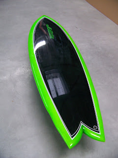 swirl en résine teintée sur fish addiction sur lequel nous allons strater des ailerons fixes en bois john cherry, et puis en dessous, planches en spray simple avec pine line simple pour t&c hawaii.
