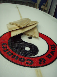 Suite au ailerons en bois que j'avais shapé en single foil, voici donc la suite, avec un projet que j'ai réalisé d'une planche pour le shop uwl, un fish: un vieux vieux shape qui trainait dans le fond de l'atelier depuis fort longtemps, shapé par louis robert au skill, je l'ai donc stratifier assez light avec une couche de 6 oz pour le bottom et le top est glassé avec une couche de 6 et une couche de 4 oz. J'ai ensuite stratifier les ailerons en bois que j'avais shapé, puis j'ai fait un ponté au dessus du swallow tail, pour le leash. Puis je me suis amusé à faire une déco à l'aéro avec inscrit dessus: "MA PLANCHE EST UN...POISSON!" bref voila un joli twin pour le shop.