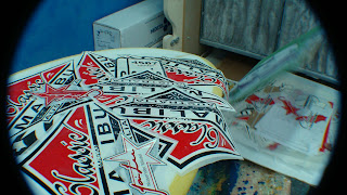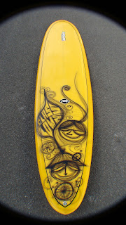 Longboard with yellow tint:top and bottom, simple pinline, artwork by myself inspired by thomas campbell, super gloss finish. For Jean-marc, thank you very much jean marc!