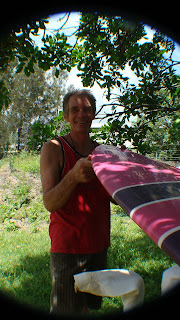 Voici mon nouveau job, a byron bay, chez michael cundith shaper depuis 1965, ami de george greenough, je bosse pendant deux mois chez lui, je suis polisher/decorateur/et je fais les finish coat (gloss coat). Je suis tres content, et lui aussi! desole je n'ai pas trop le temps, je met juste les photos et la prochaine je vous raconterais tous sur tout!!!!